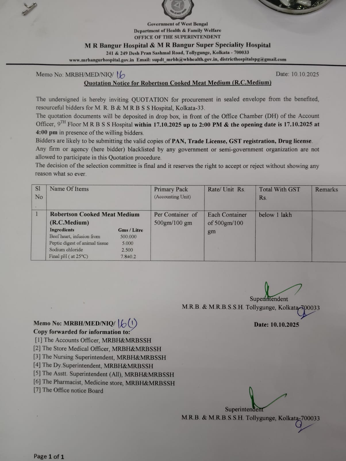| 11 | MRBH/MED/NIQ/16 | Quotation Notice for Robertson Cooked Meat Medium (R C Medium) | 10/10/2025 | 17/10/2025 | Download |